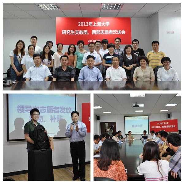 6月28日下午15:00,2013年上海大学研究生支教团、西部计划志愿者欢送会在校本部A404会议室召开。校党委副书记鲁雄刚,校长助理、研工党委书记李伟,学工办主任林海霞、社区学院党委书记王军华、团委书记胡大伟以及各相关学院分管书记出席,6名研究生支教团成员和9名西部计划志愿者及其导师、家长、辅导员代表参加会议。