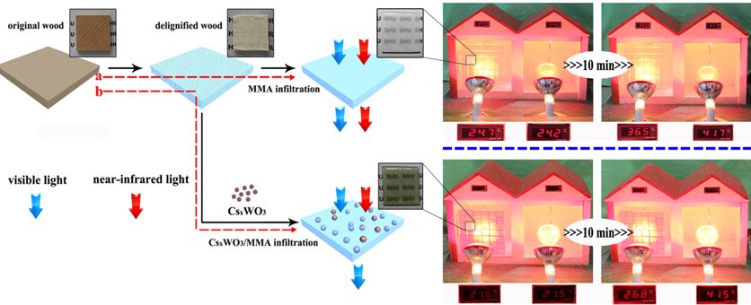 近期,上海大学材料科学与工程学院高彦峰教授课题组在节能透明木头窗研究上取得了新进展,相比普通玻璃窗在10分钟可以将室内温度从21℃升至41.5℃,透明木头窗室内只升至26.8℃,研究成果《Transparentwood containing CsxWO3 nanoparticles for heat-shielding windowapplications》发表在英国皇家化学会的期刊《材料化学A》(J. Mater. Chem. A,2017, DOI: 10.1039/C7TA00261K ),得到领域内著名科学家CGGranqvist高度点评“This is an innovative idea”,并以“Who says wooden windows wouldn’t work”为题在英国皇家化学会化学世界(https://www.chemistryworld.com/news/wooden-windows-could-make-better-buildings/3007068.article)上进行专题报道。