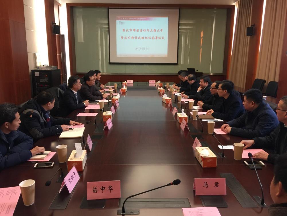 2月10日上午,安徽省淮北市委常委、濉溪县县委书记李加玉一行访问上海大学并举行技术转移战略协议签署仪式。上海大学副校长汪敏、管理学院党委书记李伟、国家大学科技园总经理兼学校技术转移中心主任施利毅等热情接待来宾。汪敏副校长在欢迎致辞中指出,要以学校综合改革和双一流建设为契机,加强校区及产学研合作,切实推进相关成果落地,提升学校服务社会的能力。李加玉书记在讲话中感谢学校在开学第一天就精心组织双方交流活动,提出县委、县政府高度重视与上海大学的合作,希望尽快启动双方实质性合作。交流活动及协议签署仪式由施利毅教授主持。 在汪敏副校长和李加玉书记共同见证下,科技园区总经理、技术转移中心主任施利毅教授和安徽省淮北市濉溪县吴杰副县长签署了《濉溪县人民政府—上海大学战略合作协议书》。参加签约仪式的濉溪县领导还有:濉溪县人大常委会主任李相军、濉溪县商务局局长刘须芹、濉溪经济开发区管委会副主任化鹏程、安徽家园铝业有限公司董事长张广勋等。我校经管中心主任山鸣峰、科技处副处长朱晓锦、科技发展研究院副院长刘桂华、招毕办副主任、材料学院汪宏斌等,管理学院马君教授、机自学院苗中华副教授、纳米中心张剑平教授、杭建忠教授及技术转移中心相关教师参加了签约仪式。交流活动后,濉溪县领导及企业代表一行参观考察了上海大学纳米中心科技成果应用单位、上海小巨人企业上海华晖新材料科技有限公司,校企合作开发的国际先进铝合金表面陶瓷涂层在海内外重大建设工程中获得应用,已取得良好的经济社会效益。