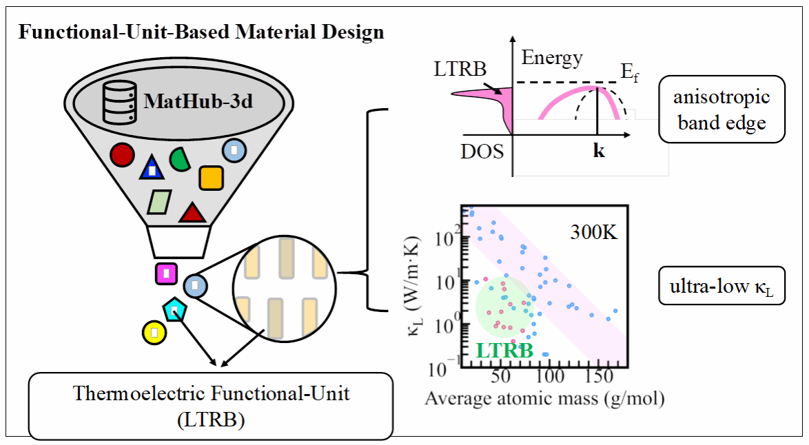 基于功能基元的材料设计是利用与所需特性相关的部分优势结构(即本文中的“功能基元”)来识别目标化合物的方法,可以达到根据需求去主动设计和筛选新材料的目的。此方法发现新材料的过程是首先识别有用的功能基元,然后在包含这些基元的化合物空间内搜索高性能材料。研究人员以设计高性能热电材料为案例,具体阐述了功能基元在材料设计中的效用。在识别优势功能基元的过程中,研究人员发现线性三原子共振键(LTRB)在结构和电子上都提供了强的各向异性,以及具有强的非谐声子散射。因此,LTRB作为一个热电功能基元被引入。随后,研究人员从上海大学材料基因组工程研究院自研的MatHub-3d (杨炯教授团队开发的具有热电特色的材料数据库平台并免费开放,http://www.mathub3d.net/)中识别出17个含有LTRB基元的半导体高性能热电候选化合物。详细的输运计算表明,含LTRB的化合物的晶格热导率不仅远低于其他具有相似平均原子质量的化合物,而且LTRB由于贡献价带附近的能态密度使得候选物价带边表现出显著的能带各向异性。此外,研究人员以具有最低晶格热导率的候选化合物K5CuSb2(300 K时为0.39 W/m·K)为例具体分析了基元[Sb-Cu-Sb]5-的共振电子结构,建立了LTRB基元与热电性能之间的关联性(热电优值ZT在800 K时为1.3)。本工作展现了具有LTRB基元的化合物表现出优异的热电性能,表明了基于功能基元的材料设计策略在发现新材料上的前景,同时也为其他功能材料的开发提供了新思路。