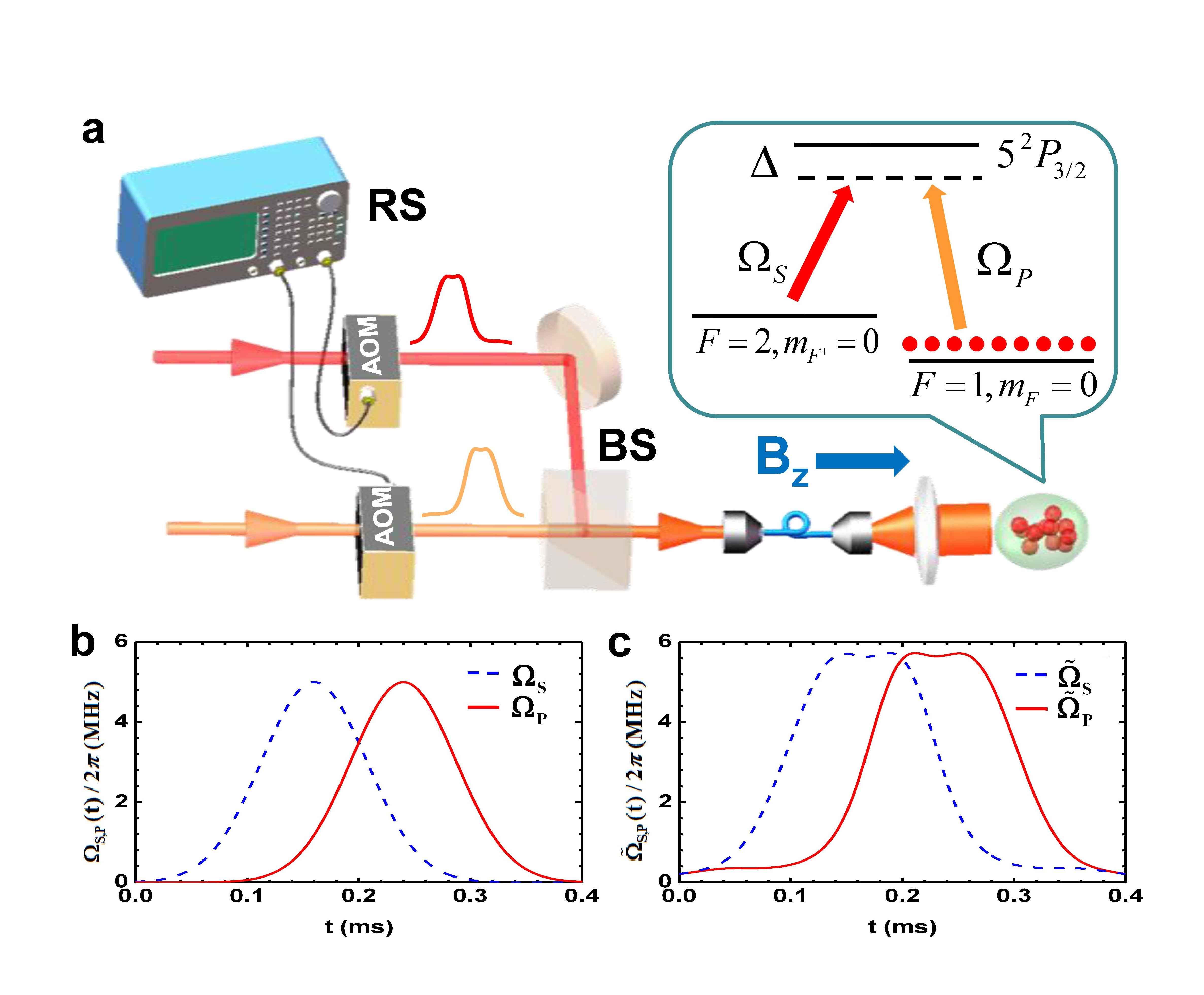 针对以上问题,我校陈玺教授和博士生李亦超理论上提出了受激拉曼绝热捷径的新方案。该方案巧妙地采用修正绝热波形的手段代替辅助微波,从而可以避免微波带来的一系列问题。随后,华南师范大学冷原子实验平台上杜炎雄博士、颜辉教授和朱诗亮教授等完成了实验验证(实验装置如图所示)。这是国际上首次实验实现了三能级系统的绝热捷径过程。实验结果证实了受激拉曼绝热捷径可以实现效率高达99%的量子态传输,并对幅度偏移、相对延时、单光子失谐等系统参数有很强的鲁棒性。由于受激拉曼绝热转移在物理、化学领域都有重要应用,该研究发展的新方法期望有广泛的应用前景。