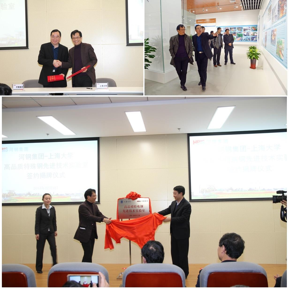 2015年12月9日,河钢集团与上海大学联合共建”高品质特殊钢先进技术实验室”签约仪式在河钢集团总部举行,河钢集团彭兆丰总经理、王新东副总经理、河钢钢研院院长/集团科技部李建新总经理、副院长吝章国和常金宝及集团科技部副总经理刘义、党委组织部副部长冯志杰和河钢石钢技术部部长刘勇以及相关部门负责人10余人参加会议。上海大学副校长汪敏教授、科技处副处长李爱军教授、材料学院院长张捷宇教授、国家重点实验室主任任忠鸣教授和吴广新副研究员出席仪式。