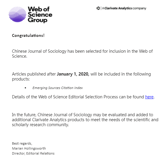 由上海大学主办、普林斯顿大学当代中国研究中心协办、SAGE出版发行的国际化英文学术季刊Chinese Journal of Sociology(《社会》英文刊)正式被ESCI 数据库收录。此前,期刊已被Scopus、ProQuest、知网等国内外重要数据库收录。被收入ESCI是CJS创刊以来取得的重大成就,为CJS进入SSCI目录奠定坚实的基础。这也是上海大学文科类国际期刊取得的重要突破,彰显着《社会》中文刊和上海大学文科类期刊的国际影响力。