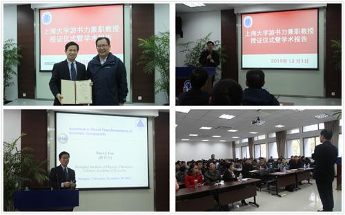 2015年12月1日上午,上海大学游书力兼职教授授证仪式在校本部HA 102顺利举行,理学院党委书记盛万成教授、化学系党总支书记陈雅丽教授、系主任许斌教授、化学系曹卫国教授、贾学顺教授、严六明教授、蒋海珍教授、李健教授及近百名化学系师生参加了授证仪式。仪式由系主任许斌教授主持。许斌教授介绍了到场来宾后,简要介绍了游书力研究员个人简历、学术成就、所获荣誉。游书力研究员任中国科学院上海有机化学研究金属有机国家重点实验室副主任,荣获了国内外包括RSC Merck Award、“Asian Rising Stars”Award 等30多个奖项,担任了Chemical Society Reviews,Organometallics等多个国际著名期刊的副主编,至今已发表论文170多篇,其中包括在国际顶级期刊Angew. Chem.和J. Am. Chem. Soc.上发表论文30多篇。