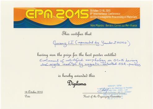 2015年10月12 -16日,第八届国际材料电磁加工会议(The 8thInternational Conference on Electromagnetic Processing of Materials-EPM 2015)在法国戛纳举行,这是国际上材料电磁加工领域最重要的国际会议,来自国际上二十个国家的近200名著名学者和研究人员参加了本次会议。会议采用无记名投票方式选出2名最佳墙报奖获奖者(Best Poster Award)。上海大学材料学院钟云波研究员指导的博士研究生李强同学投稿参加了此次大会,并获得了这一殊荣,另一名获奖者来自德国。