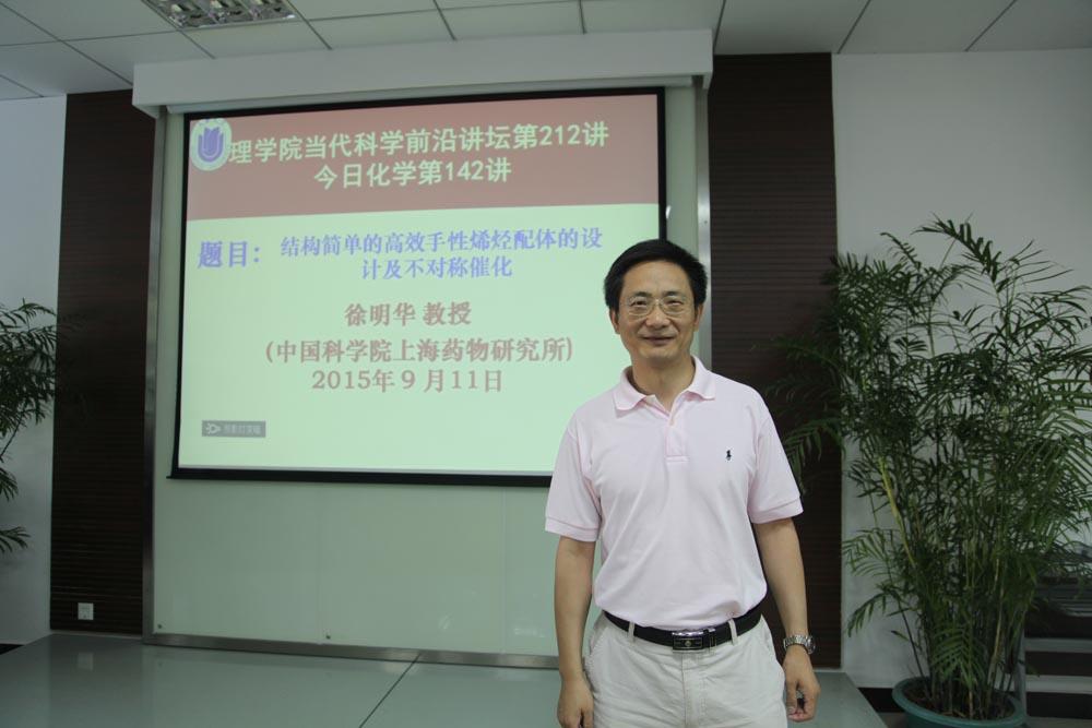 9月11日,应理学院化学系邀请,中国科学院上海药物研究所的徐明华教授访问化学系。上午,徐教授在校本部HA102作学术报告,题目为“结构简单的高效手性烯烃配体的设计及不对称催化”。该学术报告为理学院“当代科学前沿讲坛”第212讲、今日化学系列报告第142讲。报告由化学系主任许斌教授主持,系党总支书记陈雅丽教授及100余名化学系师生参加了活动。