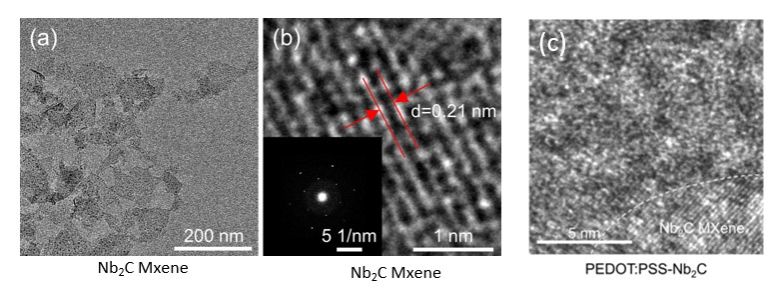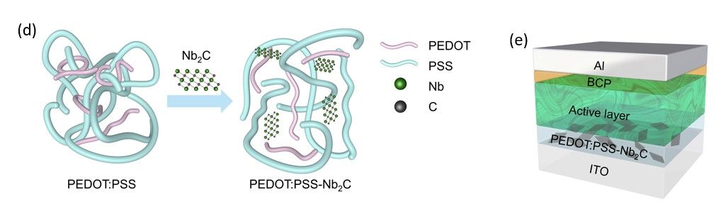 有机薄膜太阳能电池具有低成本、可溶液加工、柔性等优势,是未来柔性电子和智能穿戴领域极具潜力的电源供应者。近日,王生浩&徐韬课题组创新性地提出了一种新型可溶液加工的、基于Nb2C MXene二维材料的空穴传输层(PEDOT:PSS-Nb2C)材料,通过精细控制形貌,器件效率得到了大幅度的提升。电学、形貌、化学组成表征结果表明Nb2C MXene可以提升PEDOT:PSS薄膜的导电性并促进相分离,从而提升活性层的空穴传输速率、电荷提取能力以及降低器件的界面电阻。此外,PEDOT:PSS-Nb2C传输层材料被拓展应用于基于不同非富勒烯体系的器件中,证明了其在提升有机薄膜太阳能电池器件性能上的普适性。该研究在未来民用(如智能穿戴)和军用领域(在特殊环境下为电子元器件提供高功率密度比的电能)均有重要的意义。上海大学为本文第一署名单位,中欧学院研究生邓宝中为论文第一作者,材料基因组工程研究院的王生浩教授、中欧学院的徐韬副教授和上海高压科学与技术先进研究中心(上海-张江)的董洪亮研究员为论文的共同通讯作者,材料基因组工程研究院的王子涵高级实验师为本工作测试了高质量高分辨透射电镜照片,上海大学为本文第一署名单位,中欧学院研究生邓宝中为论文第一作者。