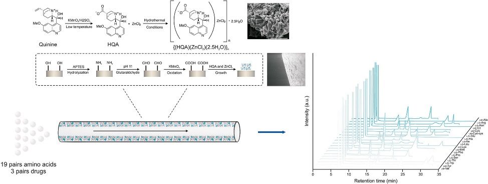 “A chiral metal-organic framework {(HQA)(ZnCl2)(2.5H2O)n} for the enantioseparation of chiral amino acids and drugs”一文以手性分离研究过程中面临的挑战作为切入点,重点分享了基于MOF材料的毛细管电色谱方法的构建及应用。