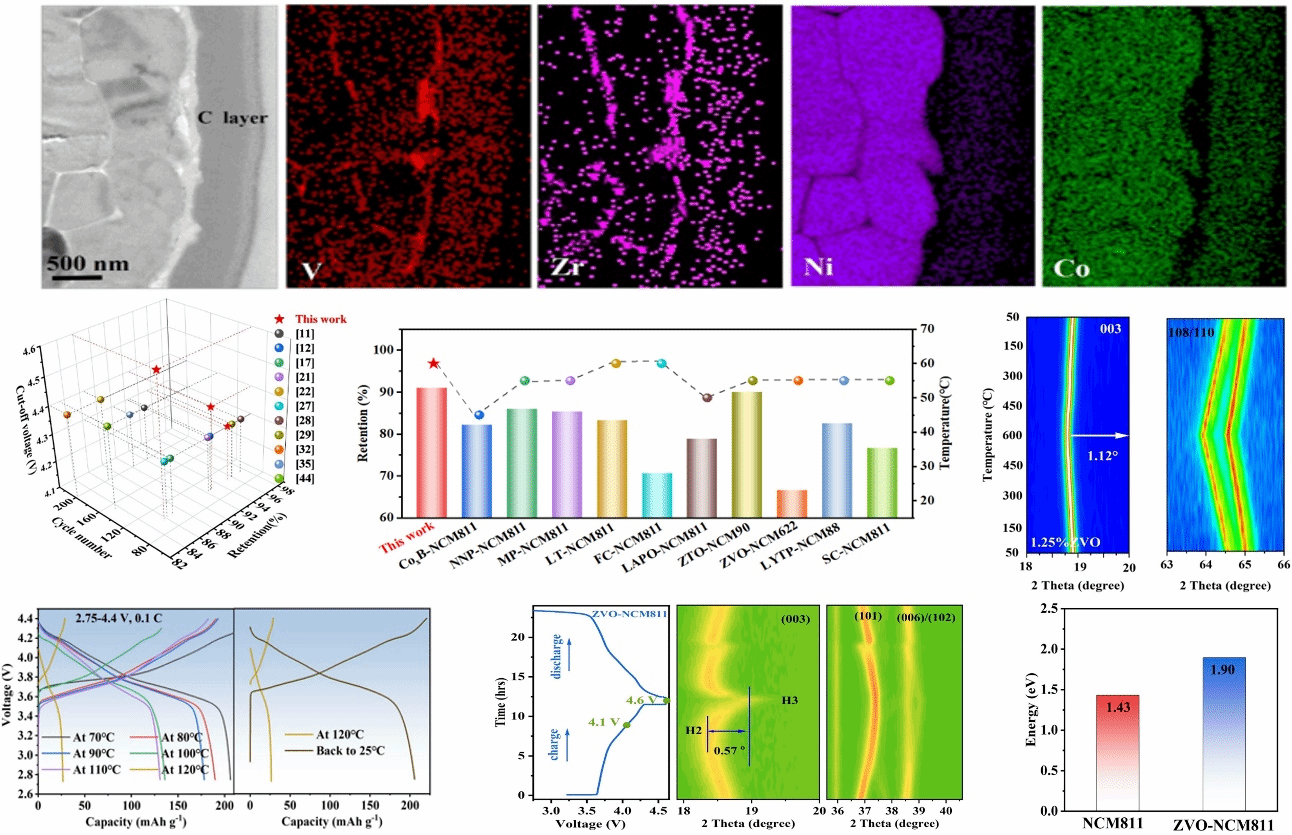 该研究工作,首次报道在富镍层状正极材料的二次颗粒和一次颗粒上构建了具有负热膨胀特性的高导电性ZrV2O7保护层,该策略可显著减轻副产物的积累、晶间/晶内裂纹的产生,抑制微观结构(较少的微裂纹)、相变(H1-H2-H3)和副反应(LiF和LixPOyFz),DFT计算表明,ZVO-NCM811正极材料的电导率和晶格氧稳定性(1.90 eV对1.43 eV)得到了改善。即使在高截止电压(4.6 Vvs.Li/Li+)或高温(60 ℃下100次循环后95.3%的容量保持率)下,所生产的ZVO-NMC811也表现出稳定的循环性能(100次循环之后86.5%)和倍率容量(30 C下67.1 mAh g-1),在危险的温度下,锂离子通道在120 ℃时迅速关闭,限制电池的进一步放热,从而降低热失控风险。