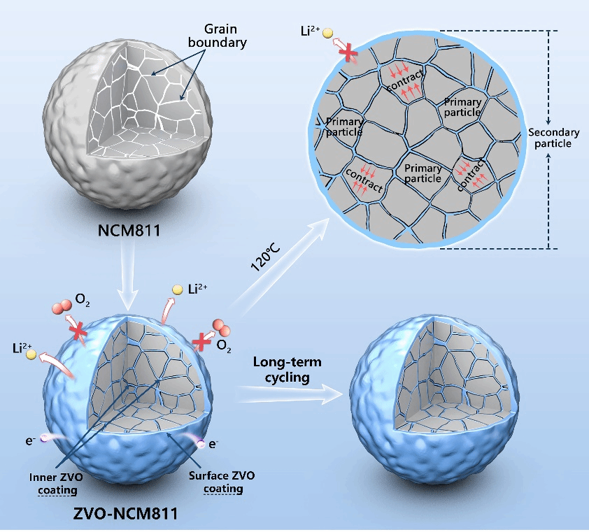 富镍正极材料的二次颗粒和一次颗粒上ZrV2O7保护层的作用机制