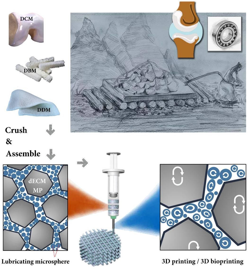 近日,根据颗粒润滑和关节润滑的原理,上海大学材料科学与工程学院高分子材料系的张坤玺副教授、尹静波教授团队建立了一种高效、通用的、可用于3D打印的高含量dECM微颗粒基异质性颗粒墨水的制备方法,研究成果发表在高水平期刊《Advanced Functional Materials》(影响因子:19.000),论文题目为“Lubricating Micro-Interface Assisted General Strategy for PreparingdECM-Microparticle–Based Heterogeneous Granular Inks toward 3D Printing”,上海大学为第一作者和第一通讯作者单位,同济大学附属同济医院、中国人民解放军海军军医大学为合作单位。