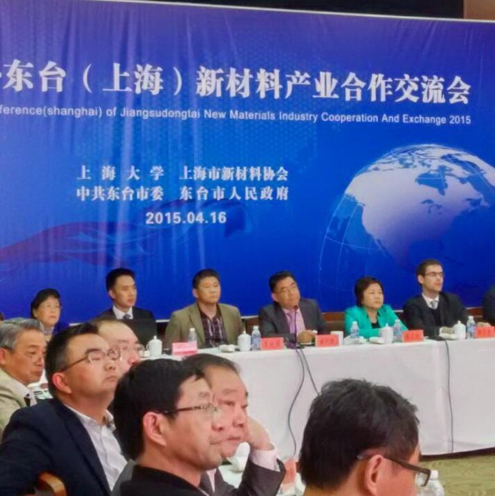 2015年4月16日,江苏东台(上海)新材料产业合作交流会在上海虹桥云峰宾馆隆重举行,本次交流会由中共东台市委、市人民政府、上海大学、上海市新材料协会联合举行,出席会议的有东台市委副书记、市长陈卫红及市委宣传部、市开发区的部分领导、上海大学科技发展研究院院长施利毅及上海大学科技处朱晓锦副处长,出席会议代表有奥地利驻上海总领事馆首席科技官斯蒂芬、上海市新材料协会副会长吕家申和黄双顶秘书长,应邀出席的代表还包括东台开发区企业代表、受邀的上海优秀企业家及企业代表。