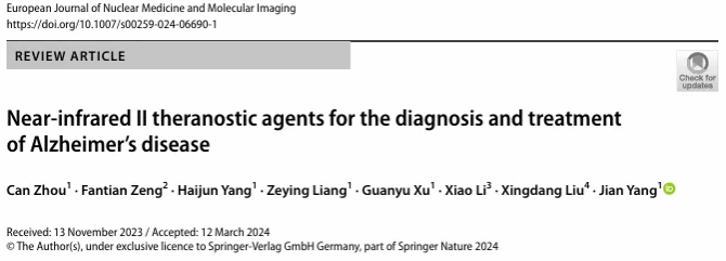 近日,上海大学医学院杨剑副教授团队/上海四一一医院(上海大学附属四一一医院)在分子影像领域的TOP期刊《European Journal of Nuclear Medicine and Molecular Imaging》(中科院1区IF=9.1)上发表名为“Near-infrared II theranostic agents for the diagnosis and treatment of Alzheimer’s disease”(近红外II区分子用于阿尔茨海默症诊断和治疗的研究进展)的综述论文。近红外II区荧光成像因其独特的优势,在AD诊断和治疗方面具有巨大的潜力。基于近红外Ⅱ区荧光成像,作者对当前用于AD的诊断的近红外Ⅱ区分子探针以及基于近红外Ⅱ区分子用于AD的光热治疗及光动力治疗进行了系统性概述,探讨了在AD诊断与治疗过程中遇到的问题与挑战,并对未来AD的诊断与治疗做出了展望。