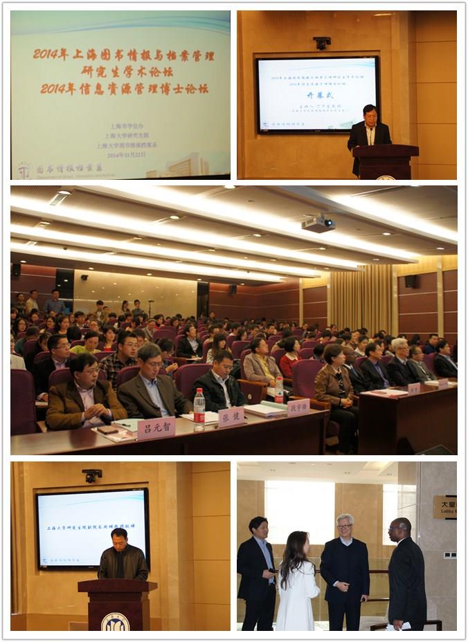 为了增进图书情报和档案管理学科博士生与硕士生之间的学术交流,由上海市学位办主办,上海大学研究生院、上海大学图书情报档案系承办的2014年上海图书情报与档案管理研究生学术论坛暨2014信息资源管理博士论坛于11月22日在上海大学乐乎楼2号楼学海厅开幕,为期两天。参加此次开幕式的嘉宾有上海图书馆馆长吴建中教授、国际原子能机构档案馆馆长Shadrack Katuu教授、广西民族大学副校长黄世喆教授、中国人民大学信息资源管理学院院长张斌教授、吉林大学信息管理系主任李贺教授、华东师范大学信息学系段宇锋教授、南京政治学院上海校区军事信息管理系副主任张健副教授、上海师范大学档案学系主任吕元智副教授、郑州航空工业管理学院信管中心主任李泽锋教授、上海大学研究生院领导周明副教授、上海大学图书情报档案系主任金波教授及丁华东教授、吕斌教授、连志英教授、于英香教授等多位专家和学者以及中国人民大学、中国科学院、武汉大学、南京大学、吉林大学、南京理工大学、云南大学、兰州商学院、南京政治学院上海校区、华东师范大学、复旦大学、上海师范大学、上海大学等培养单位的160余博士生和硕士生。