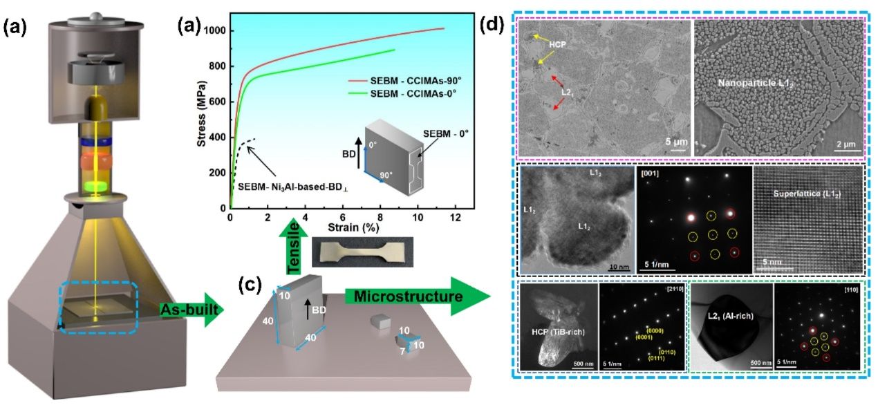 图5. (a)电子束粉末床融化设备示意图,(b)垂直和平行打印方向的拉伸件力学性能,(c)打印样品尺寸的示意图,(d)打印样品的SEM图和TEM图片,微观结构展示了各种析出相。