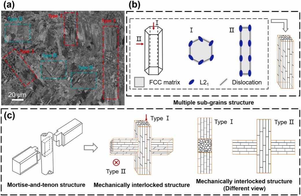 图 4. AM-FCNAT微结构示意图。(a)AM-FCNAT的XY平面的电子通道衬度图像显示了多重机械互锁结构,(b)AM-FCNAT的亚晶和多亚晶结构示意图,(c)受榫卯结构启发的机械互锁结构示意图。