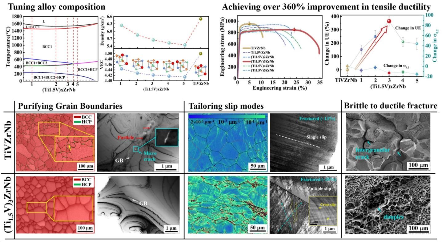 进展七:轻质高/中熵合金具有高强度与轻量化的双重优势。然而,这类合金室温下的拉伸延展性有限,这限制了它们在工程领域的广泛应用,特别是对于航空航天结构部件。近期的研究发现,调控TiVZrNb中熵合金中的钛(Ti)和钒(V)含量,可以显著提高它们在室温下的拉伸延展性,甚至达到了三到四倍的提升。这项研究不仅解决了科学家们长期以来的困扰,还为工程应用开辟了新的可能性。具体来说,通过系统调节Ti和V的含量,研究人员揭示了一种内在的延展性机制。这种机制使得断裂形式从晶间脆性断裂向韧性断裂转变。此外,调控后的变形机制也从单一滑移模式演变为多重协同滑移模式,而合金的强度并未明显降低。以(Ti1.5V)3ZrNb为例,相比等摩尔比的TiVZrNb中熵合金,其延伸率提高了360%,同时保持了约800 MPa的高屈服强度。这一成果显示,合金构成元素的调控不仅通过减少有害相而净化晶界,还调控了变形位错构型。这些见解为轻质难熔中熵合金的应用提供了新的思路和方向。[该成果由贾岳飞博后完成,卞西磊副研究员和王刚教授指导,发表于Journal of Materials Science & Technology(2024),https://doi.org/10.1016/j.jmst.2024.04.020]