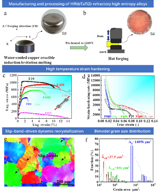 图6. (a)和(b) 公斤级HfNbTaTiZr熔炼和高温多向锻造示意图,(c)和(d) 高温拉伸应力应变曲线和应变硬化率曲线,(e) F400试样变形组织,(f) 动态再结晶和原始粗晶晶粒统计分布图。