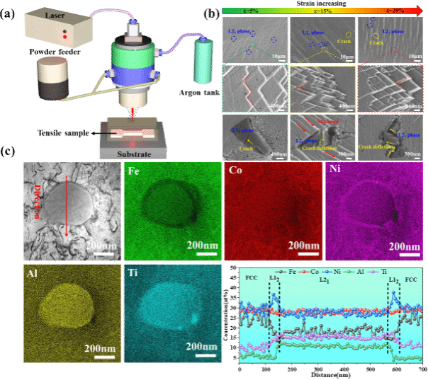 图2. (a) 直接能量沉积示意图,(b) (FeCoNi)86Al7Ti7高熵合金拉伸试样在不同拉伸应变下的表面形态变化,(c) 亚稳态核壳沉淀析出相的面扫和线扫能谱图像。