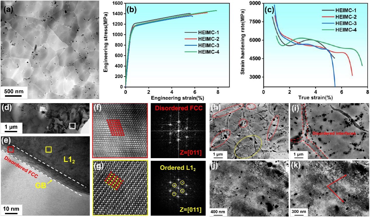 图1. (a)HEIMC-4样品的HAADF STEM图像,(b)HEIMC-1、-2、-3和-4样品的拉伸工程应力-应变曲线,(c)对应的应变硬化曲线,(d-g)晶界处的TEM图像,(h-k)电子通道衬度图像。