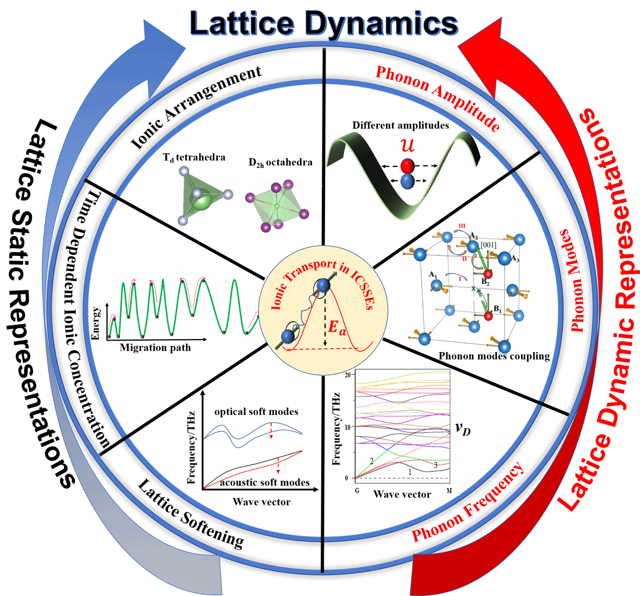 图1.晶格动力学各因素的划分及其对离子输运行为的影响。