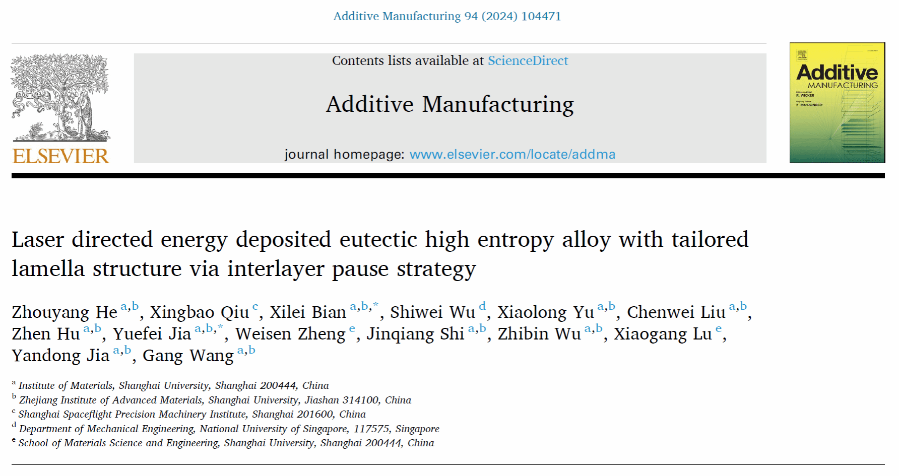 近日,材料学院无序合金团队针对当前LDED技术制备的AlCoCrFeNi2.1共晶高熵合金(EHEAs)并未表现出令人满意的强度-延展性组合这一难题,提出了一种简单、新颖的层间暂停策略,可原位调控共晶片层的微观组织结构,以增强合金的强度和延展性。相关成果以题为“Laser directed energy deposited eutectic high entropy alloy with tailored lamella structure via interlayer pause strategy”发表在增材制造领域国际顶级期刊《Additive Manufacturing》(中国科学院一区Top期刊,IF=10.3)。何洲洋硕士研究生为论文第一作者,卞西磊副研究员(导师)、贾岳飞博后为共同通讯作者。该项研究得到了国家自然科学基金,上海市自然科学基金,西工大凝固技术国家重点实验室开放课题,上海市教委创新计划,国防科技173计划,中国载人航天工程空间利用系统项目和上海市科技创新计划等项目的资助。
