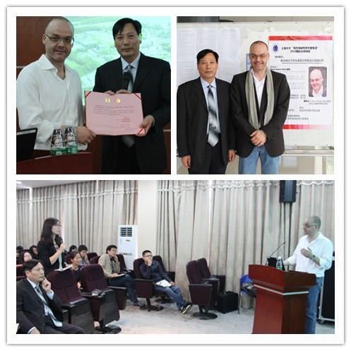 10月31日上午,Klok教授抵达上海大学环化学院。他首先参观了环化学院实验室,并与陈捷教授在研究领域方面进行了深入交流。学术报告于下午一点三十分在材料学院520室正式开始。陈捷教授首先致欢迎辞,并向Klok教授颁发了上海大学环化学院客座教授的聘书。Klok教授首先介绍了目前可控活性自由基聚合技术在聚合物分子刷方面的最新研究进展,以及现有技术在表面与界面改性方面的使用范围和可行性。接下来,他介绍了精确表面化学表征的需要以及在聚合物薄膜上准确定位和测量官能团分布的相关挑战。最后,他介绍了最新的高分子科学工具在研发智能超薄聚合物薄膜的应用。这种薄膜可用于控制流体流动或控制复杂三维基材表面金属及非金属无极薄膜的形成。报告结束后,Klok教授与到场的学生和老师进行了热烈的讨论,并表示作为环化学院的客座教授,会定期来校访问,进行相关的学术交流。