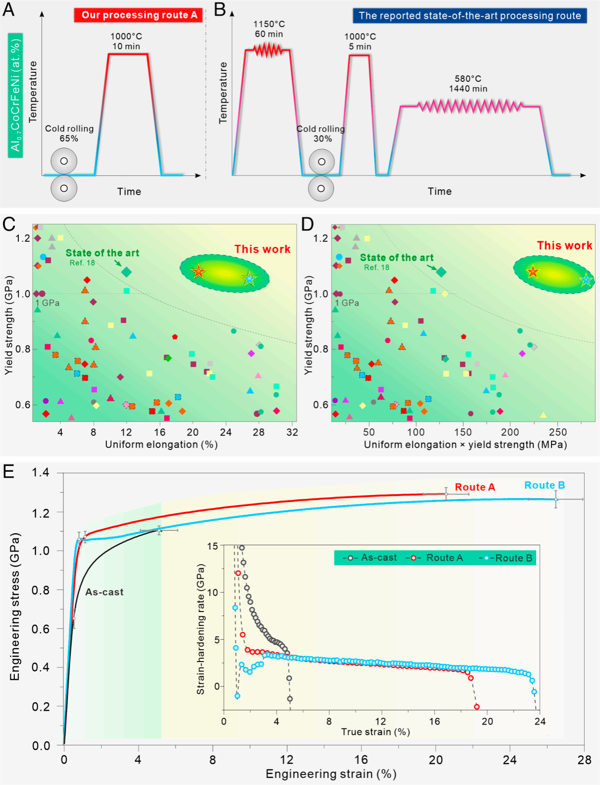 图2 Al0.7CoCrFeNi多主元合金的高效热处理工艺及优异力学性能组合