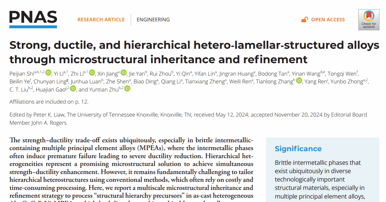 近日,上海大学材料学院钟云波教授领衔的高性能结构功能材料超常冶金与制备研究团队,通过创新的多尺度微观结构遗传和细化策略,成功在多主元合金中制备出了一种独特的多级异质层片结构,实现了优异的强塑性匹配。该成果以“Strong, ductile, and hierarchical hetero-lamellar-structured alloys through microstructural inheritance and refinement”为题,在国际权威期刊PNAS上发表,全称《美国国家科学院院刊》(Proceedings of the National Academy of Sciences)。