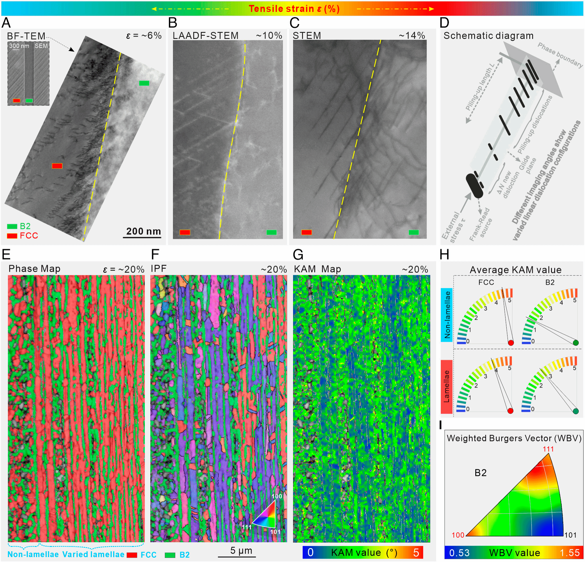 图3 HLS多主元合金中不同特征区域的强烈、逐步增加的位错堆积和跨尺度的、拓扑变化的异质变形