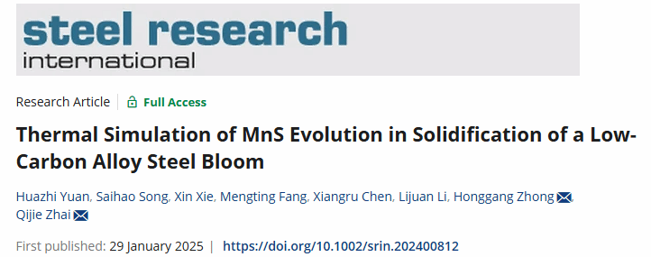 上海大学先进凝固技术中心(简称CAST)团队利用连铸坯枝晶生长热模拟技术研究了不同连铸节点MnS的析出长大规律,研究成果以 “Thermal simulation of MnS evolution in solidification of a low-carbon alloy steel bloom”为题发表在冶金领域经典学术期刊《Steel research international》。该论文第一作者为袁华志博士研究生,通讯作者为翟启杰教授和仲红刚副研究员。