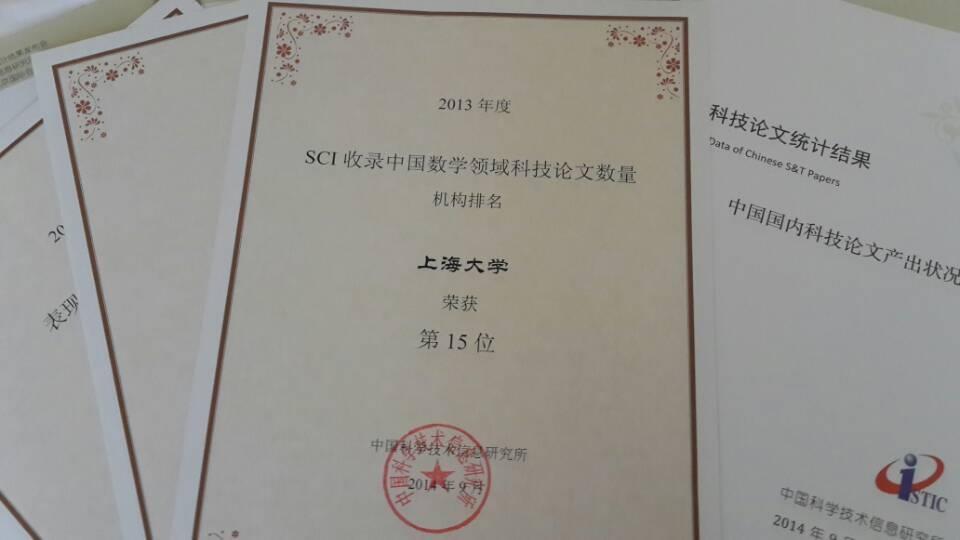 据机构产出统计报告,2013年度上海大学作为第一作者单位被科学引文索引扩展版(SCIE)收录的论文930篇,在全国高等院校排名第50位(2012年度同类收录论文823篇,排名第38位)。且2004-2013年4656篇论文被引用43385次,在全国高等院校排名中列第33位。上海大学SCI学科影响因子前1/10的期刊论文共121篇,在全国高等院校排名中列为第40名(上一年度相关论文75篇,位居第37位)。可喜的是,在SCI中国数学领域收录科技论文数量方面,我校在上一年度全国高校排名第20位的成绩上继续进步,荣得2013年度SCI收录中国数学领域科技论文数量机构排名第15位。