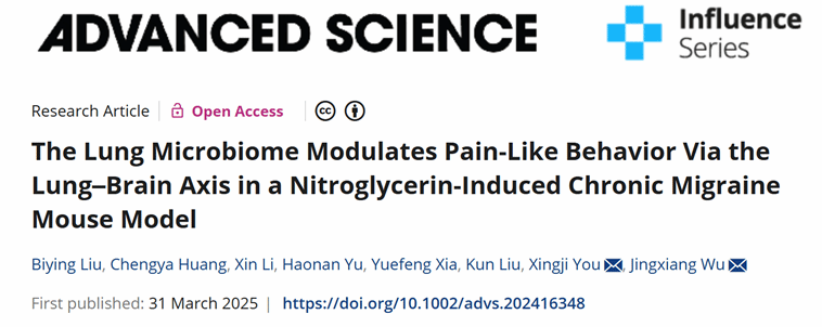 近日,上海交通大学胸科医院麻醉科吴镜湘教授&上海大学医学院游兴姬副教授研究团队在综合性TOP期刊《Advanced Science》(中科院期刊1区,IF=14.3),发表了名为“The Lung Microbiome Modulates Pain-Like Behavior Via the Lung–Brain Axis in a Nitroglycerin-Induced Chronic Migraine Mouse Model”的研究论文,上海大学医学院为该论文的共同通讯作者单位。