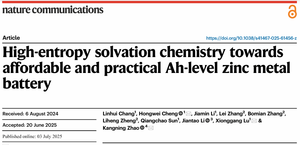 近日,上海大学材料学院博士研究生常麟晖以第一作者在国际顶级期刊《Nature Communications》(自然·通讯)发表题为“High-Entropy Solvation Chemistry towards Affordable and Practical Ah-level Zinc Metal Battery”的研究论文。上海大学为第一单位,上海大学程红伟教授、鲁雄刚教授和大湾区大学赵康宁助理教授为共同通讯作者。