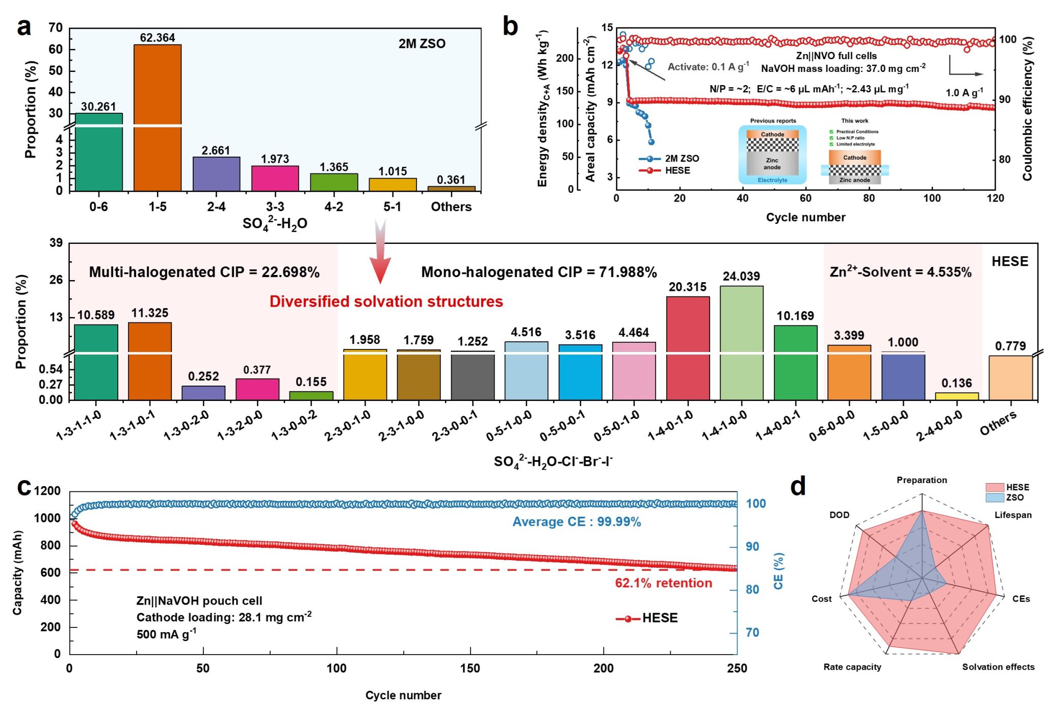 图2 HESE的高熵溶剂化结构分布及实用性电池性能展示(Nature Communications, 2025, 16, 6134)