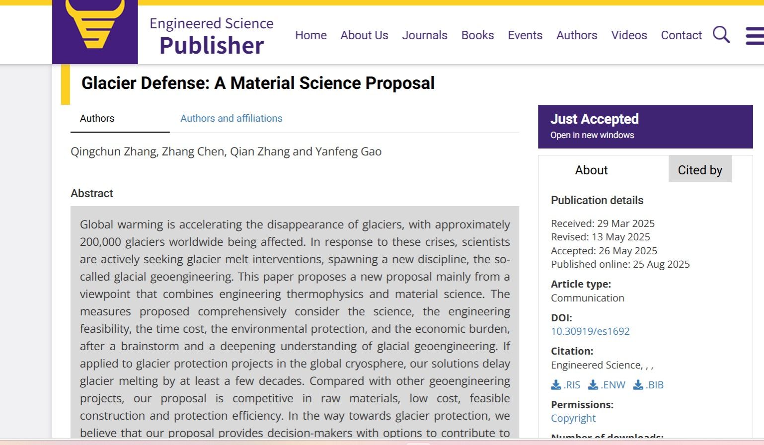在此背景下,上海大学材料科学与工程学院高彦峰教授团队展开深入研讨,从工程热物理角度系统分析了冰川融化的机理,并综合考量科学性、工程可行性、时间成本、环保性与经济性等多重因素,提出了一项可行的冰川保护新方案。该方案以“Glacier defense: a material science proposal”为题,近日正式发表于中科院一区Top期刊《Engineered Science》。该期刊聚焦工程与多学科交叉研究,在推动前沿理论突破与重大工程应用对接方面具有显著的学术影响力。