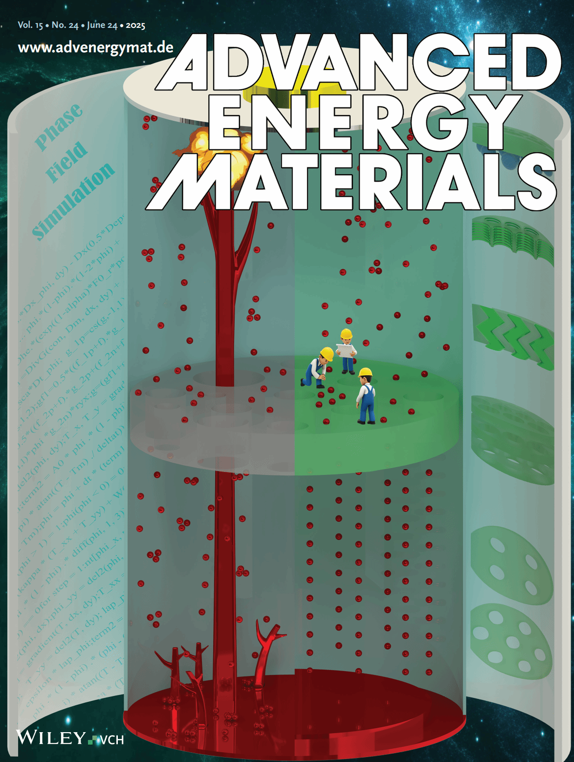 上海大学核电关键材料全国重点实验室施思齐教授团队在国际能源材料期刊《Advanced Energy Materials》(影响因子:26.8)发表题为“Proactive Lithium Dendrite Regulation Enabled by Manipulating Separator Microstructure Using High-Fidelity Phase-Field Simulation”的论文。上海大学为第一单位,上海大学的李亚捷副教授为第一作者,上海大学的施思齐教授和阿卜杜拉国王科技大学的张更博士为共同通讯作者,论文合作者还包括上海大学的硕士研究生陈斌和王依平,江苏师范大学的林雨潇教授,悉尼大学的Maxim Avdeev教授。该工作被评选为《Advanced Energy Materials》封面文章(Vol. 15, No. 24, June 24, 2025)。