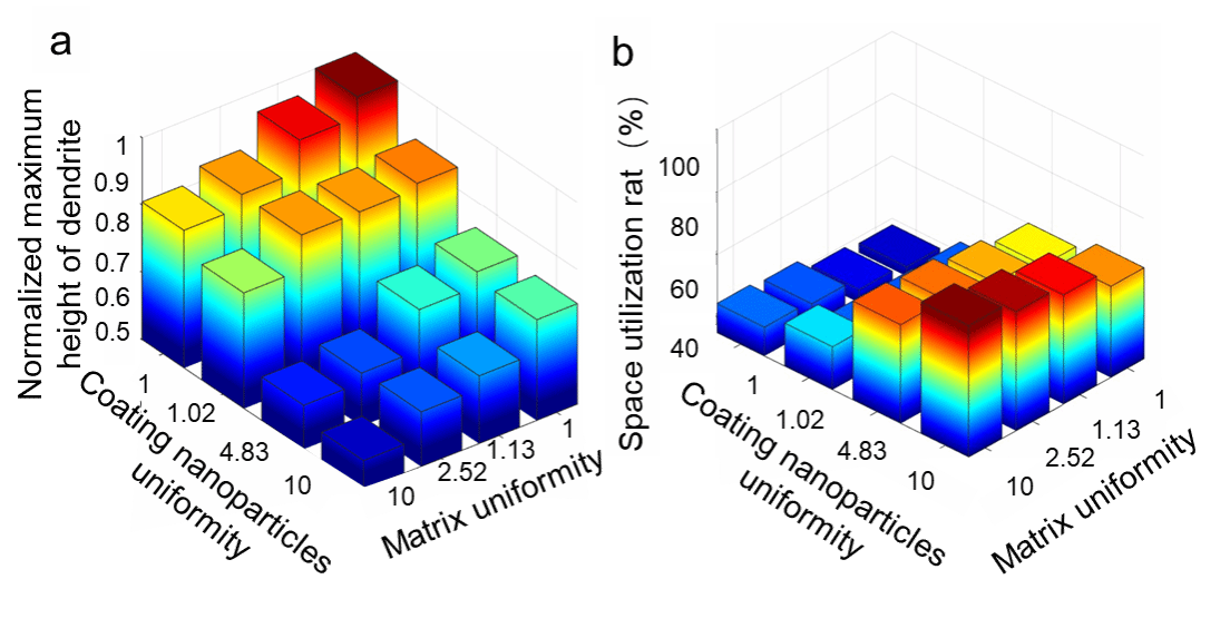 图2. 相场模拟时间为 15 秒时,枝晶最大高度(归一化后)与隔膜基体均匀度及隔膜涂覆纳米颗粒均匀度的关系(a),隔膜基体均匀度及隔膜涂覆纳米颗粒均匀度的关系(b)。