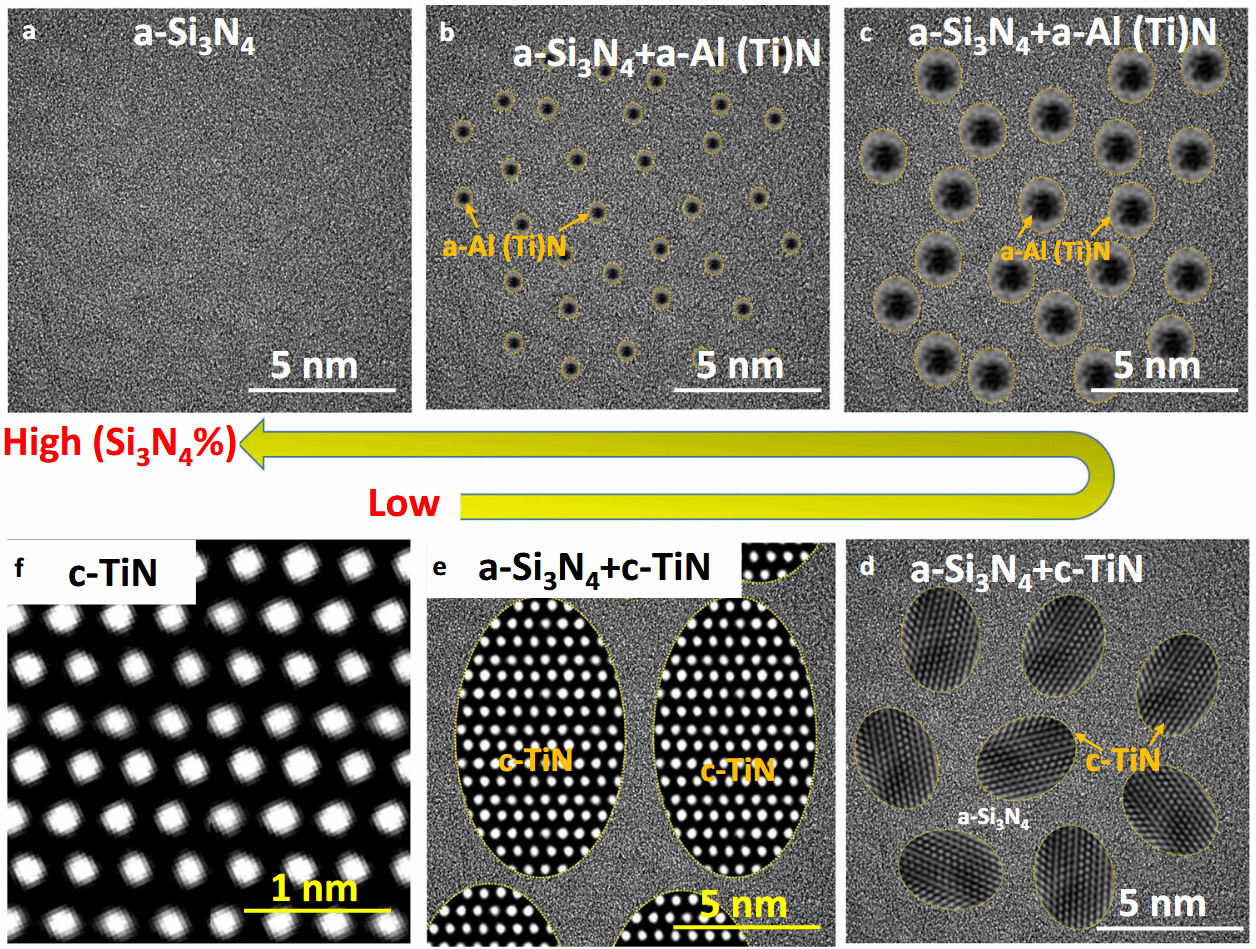 近日,上海大学材料基因组工程研究院/上海大学核电关键材料全国重点实验室高兆和副教授(张统一院士团队)联合英国曼彻斯特大学、英国国家材料实验室、伯明翰大学、美国伊利诺伊大学厄巴纳-香槟分校、加拿大蒙特利尔综合理工大学、英国曼彻斯特城市大学、考文垂大学、澳大利亚莫纳什大学等单位,在非晶Si₃N₄基体中引入致密、弥散分布的非晶Al(Ti)N纳米颗粒(尺寸约为1nm或以上、相体积分数为6–70%),在隔热涂层领域取得重要研究进展;在非晶Si₃N₄基体中引入晶体TiN纳米颗粒(5-15 nm,体积分数61-88%)可显著提升涂层热导率,适配高功率宽禁带半导体材料和器件等亟需高热导领域。相关成果以“Dual phase high temperature Si₃N₄/Al (Ti) N films with tunable thermal conductivity”为题,在线发表于国际顶级学术期刊《自然·通讯》(Nature Communications16:11555(2025))(影响因子:15.7)。上海大学材料基因组工程研究院高兆和副教授为第一作者和通讯作者,英国工程院涂层首席Ping Xiao教授和伯明翰大学电镜中心主任Yu-Lung Chiu教授为共同通讯,英国工程院院士和中国工程院外籍院士PhilipJ.Withers教授/爵士和磁控专家Peter Kelly教授也参与此工作。美国伊利诺伊大学厄巴纳-香槟分校‘MinimumThermal Conductivity’理论提出者David Cahill教授对此工作给了极大的帮助和指导。