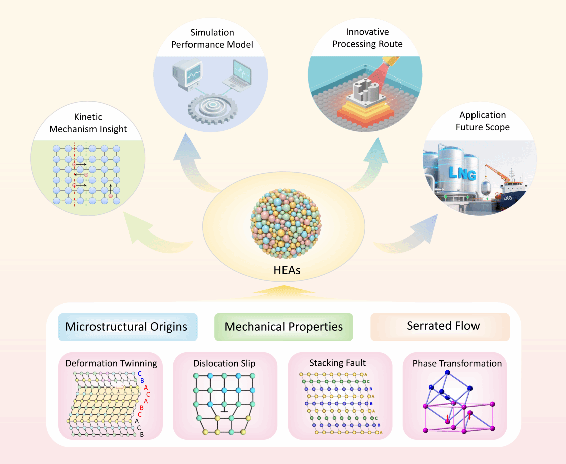 高熵合金在低温条件下表现出卓越的力学性能,突破了传统金属材料中普遍存在的强度-塑性掣肘关系。上述研究成果还系统综述了近年来关于高熵合金低温变形机制、微结构演化及其反常力学响应的研究进展,其优异性能源于变形孪晶、位错滑移、层错及相变等多种变形机制的协同作用,这一过程受到温度依赖的层错能及复杂内应力场的共同调控。塑性变形过程中出现的锯齿流动现象,则反映了局部相不稳定性与缺陷相互作用的耦合效应。同时,该研究还强调了高熵合金在低温工程应用中的巨大潜力,指出当前研究中仍存在的关键科学问题,包括应变局部化的起源以及多尺度缺陷在延迟断裂中的作用(图4)。未来研究还将重点发展先进的原位表征技术、多物理场耦合建模方法,并面向极端服役环境开展新型高熵合金成分与组织结构设计。