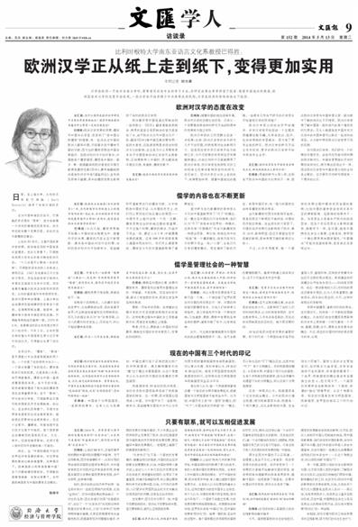 2014年5月13日,《文汇报》第09版“访谈录·文汇学人”专栏整版刊登我校社会发展研究院特聘研究员、比利时根特大学南东亚语言文化系教授巴得胜(Bart Dessein)专访,文章题目为《欧洲汉学正从纸上走到纸下,变得更加实用》。