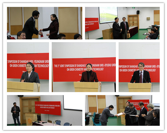 2013年11月22日,首届上海大学(中国)-岭南大学(韩国)-九州大学(日本)绿色化学与清洁生产三边国际研讨会(1st Joint Symposium ofShanghai University -Yeungnam University -Kyushu University on Green Chemistry and Clean Technology)在上海大学顺利召开。参与研讨会的中日韩三国师生围绕着当今环境和化工领域最前沿的课题,开展了热烈的讨论和交流,展示了各方在相关领域热点问题上的最新研究成果。环化学院作为本次研讨会的东道主,积极筹备各项会议议程,保证了研讨会的顺利召开,给日韩两国外宾留下了深刻的印象。