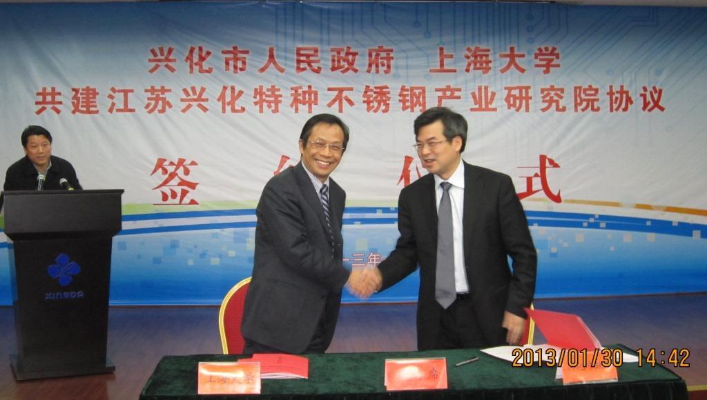 2013年1月30日,汪敏副校长率上海大学科技代表团赴江苏省兴化市,参加上海大学与兴化市人民政府共建“江苏兴化特种不锈钢产业研究院”签约仪式。我校代表团成员包括材料科学与工程学院院长张捷宇教授、材料科学与工程学院党委书记朱明原教授、材料研究所常务副所长陈业新教授、材料科学与工程学院肖学山教授、吕战鹏教授、王均安教授、洪新教授,以及科技处副处长朱晓锦教授、科技处开发科徐志平科长等。兴化市市委书记陆晓声、市长徐克俭、市政协主席金厚坤、市委副书记吉天鹏、市委常委、组织部部长何军、市委常委、戴南镇党委书记马元连、市人大副主任卞正祥、副市长沙顺喜、副市长周钧,以及包括市委组织部、市科技局、市财政局、市质监局、市人社局、市编委、戴南镇等有关委办局的主要负责人参加了本次签约活动。