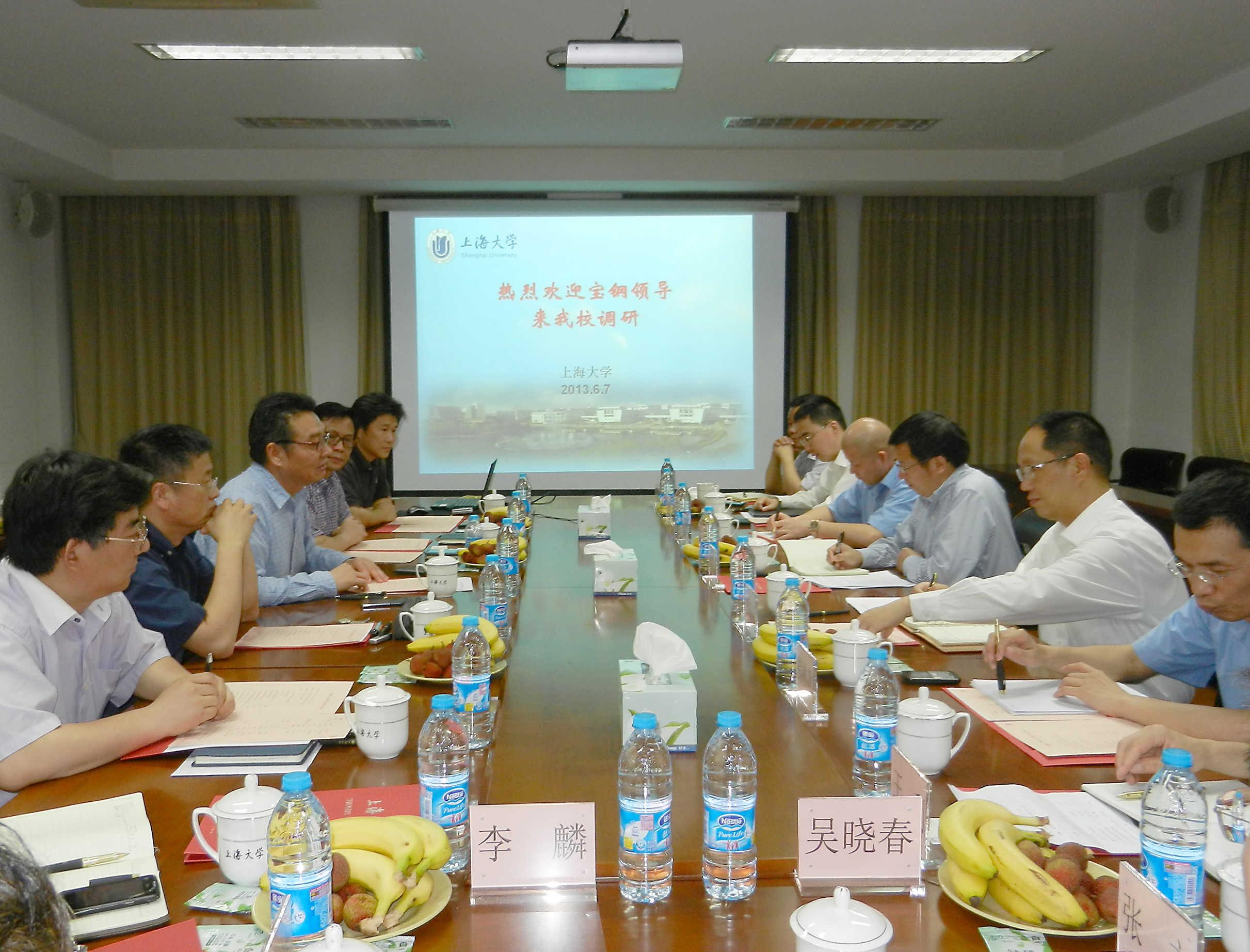 6月7日下午,宝钢股份公司副总经理储双杰、宝钢股份科技发展部部长黄伟良、宝钢股份研究院汽车用钢研究所所长蒋浩民、宝钢股份研究院炼钢研究所所长石洪志等领导和专家一行11人来我校考察和交流,上海大学校长罗宏杰、副校长汪敏、校长助理、学科办主任翟启杰出席会议,我校参加会议的还有科技处处长施利毅、科技处副处长朱晓锦、材料学院院长张捷宇、材料学院副院长吴晓春以及材料学院李麟、郑少波等教授、专家以及我校科研处相关科研管理人员。会议由校长助理、学科办主任翟启杰教授主持。