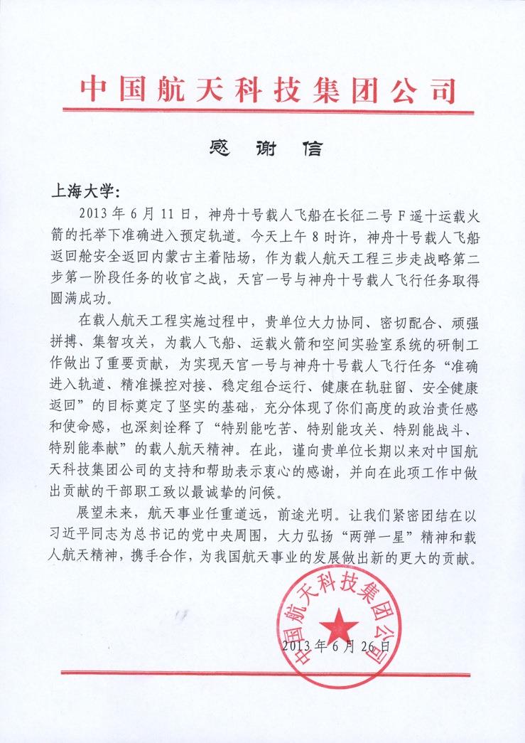 2013年7月,中国航天科技集团公司向我校发来感谢信,感谢上海大学长期以来对中国航天科技集团公司的支持和帮助,并向在载人航天工程实施过程中做出贡献的教职员工致以最诚挚的问候。在载人航天工程实施过程中,上海大学大力协同、密切配合、顽强拼搏、集智攻关,为天宫一号与神舟十号载人飞行任务圆满完成做出重要贡献,深刻诠释了“特别能吃苦、特别能攻关、特别能战斗、特别能奉献”的载人航天精神。