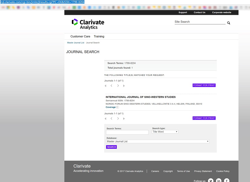International Journal of Sino-Western Studies(《国学与西学》)是一本汉英双语半年刊,由芬兰国学与西学北欧论坛负责发行,由上海大学国际合作平台上海大学宗教与中国社会研究中心与芬兰“国学与西学北欧论坛”等联合编辑出版,每年六月及十二月在芬兰以纸质与网络电子版方式同时出版,迄今已经出版12辑。在被ESCI收录之前,本刊已被芬兰国家图书馆、R&TA、ATLA、EBSCO、SCOPUS、OCCC、DOAJ等多家知名数据库收录。