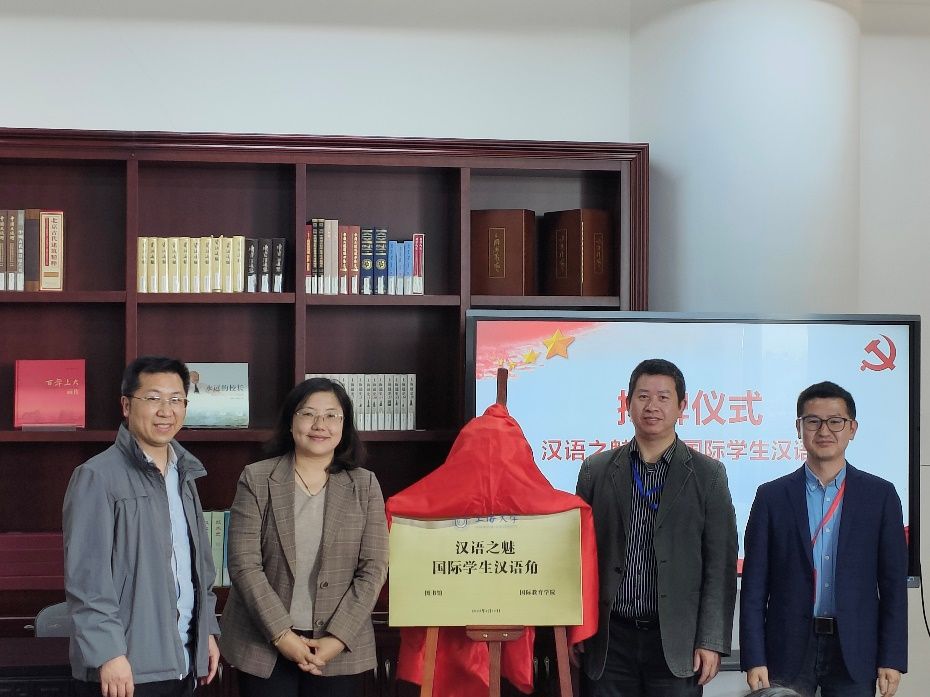 在热烈的掌声中,钱伟长图书馆档案馆博物馆党委书记王远弟与国际部党委书记王丽娜为“汉语之魅国际学生汉语角”揭牌。
