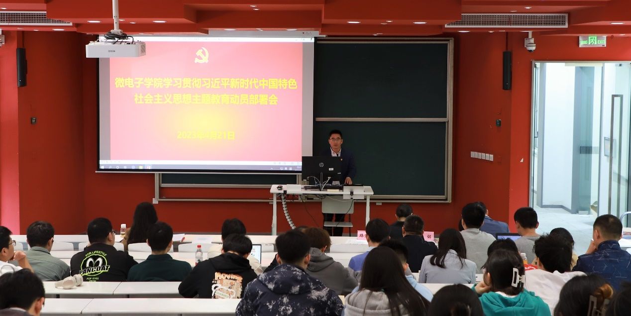4月21日,微电子学院在嘉定校区第二教学楼112开展学习贯彻习近平新时代中国特色社会主义思想主题教育动员部署会。微电子学院领导班子成员、学院党委委员、学院全体师生党员参加会议,会议由微电子学院党委副书记、副院长袁铭主持。
