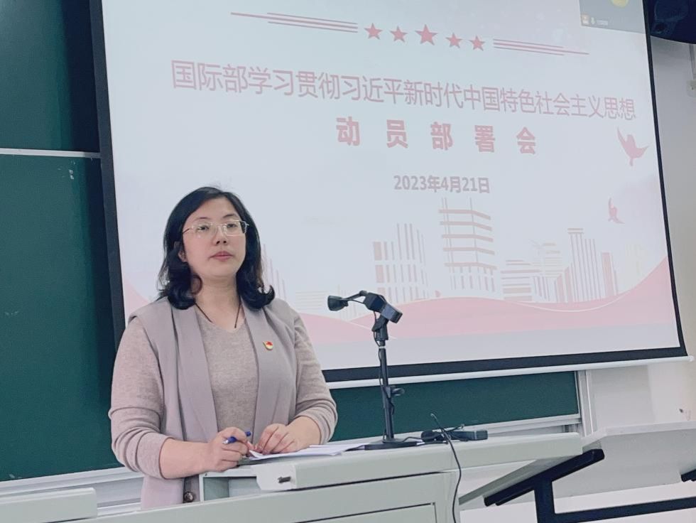 王丽娜同志首先传达学校学习贯彻习近平新时代中国特色社会主义思想主题教育动员大会上的讲话精神。指出国际部师生党员要提高站位、全面领会,深刻把握开展主题教育的重大意义、总要求和目标任务。用习近平新时代中国特色社会主义思想凝心铸魂,在坚定拥护“两个确立”、坚决做到“两个维护”上做表率。