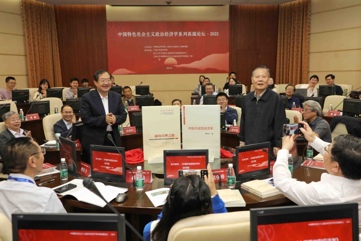 开幕式结束后,中国人民大学经济学院院长刘守英教授和复旦大学特聘教授、马克思主义经济学中国化研究中心主任周文教授共同为中国社会科学院经济研究所原所长、上海研究院首席专家裴长洪研究员的新书《中国开放型经济学》和《通向真理之路》揭牌。刘守英教授表示,《中国开放型经济学》对中国经济学的建设做出了非常大的贡献。中国的改革开放和70多年的社会主义建设实践提供了世界上最大的试验场,为建构开放经济学理论提供了最重要的素材,是马克思主义政治经济学的重要组成部分,同时也为在国际政治经济学的格局下研究中国经济学问题提供了非常必要的探索。周文教授表示,《中国开放型经济学》立足中国的实践,总结中国改革开放的经验,内容体系完整,真正体现了中国经济学的立场、观点和体系。同时正如《通向真理之路》一书副标题“寻求当代中国马克思主义政治经济学的新境界”所指出,本书汇集了2021年中国特色社会主义政治经济学高端论坛上专家学者们的重要观点,是中国特色社会主义政治经济学最新观点、最新成果的重要汇编。